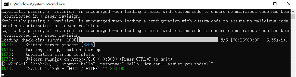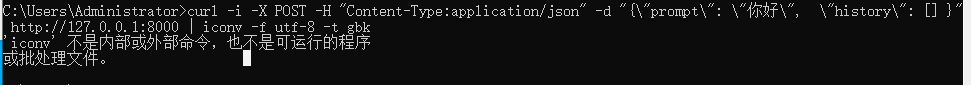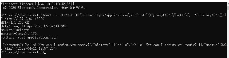 curl -i -X POST -H "Content-Type:application/json" -d "{\"prompt\": \"hello\", \"history\": [] }" http://127.0.0.1:8000