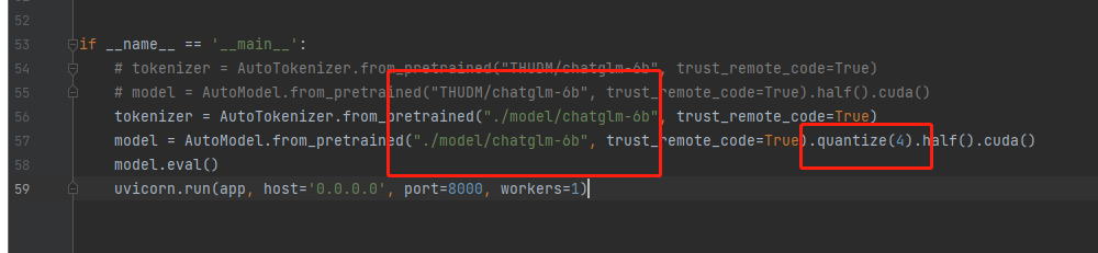 秋叶的包缺少部分文件,需要自行下载Api.py文件,同时修改部分代码,参考下图:修改了model的位置,本地显存不够,需要多加一个.quantize(4),以量化方式加载模型。
